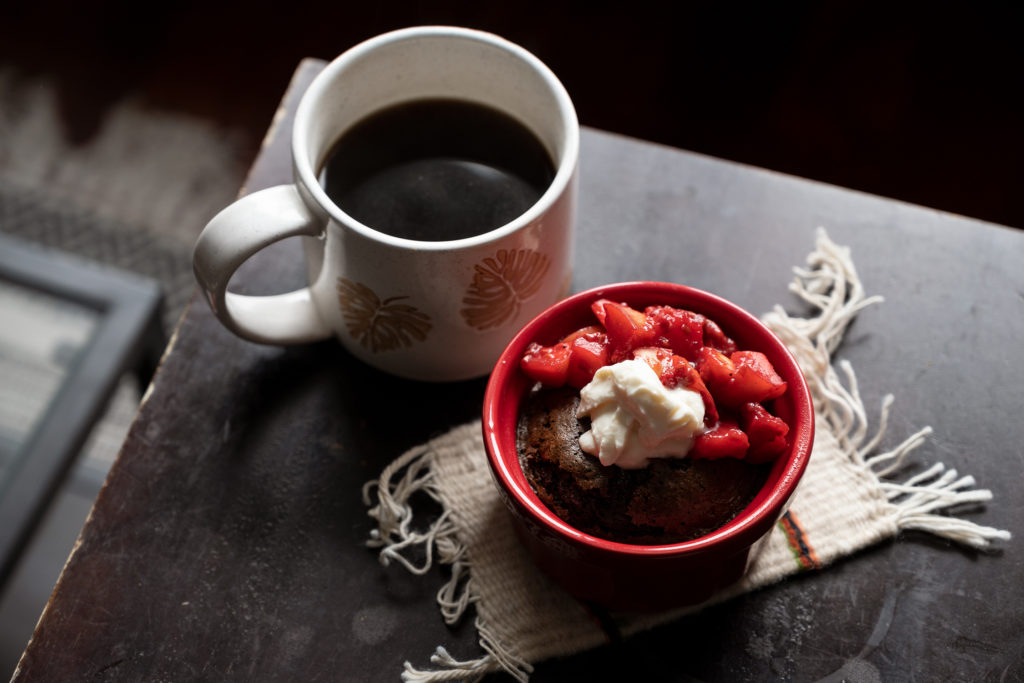 Because when you’re bored and feeling snacky (and have no snacks in the house because you naively thought that would keep you from snacking), why not whip up a no-recipe chocolate cake (seriously had no idea how it would turn out, just added random amounts of ingredients until it looked a cake batter consistency), brew a fresh pot of coffee and live life the right way on that 3pm Zoom?